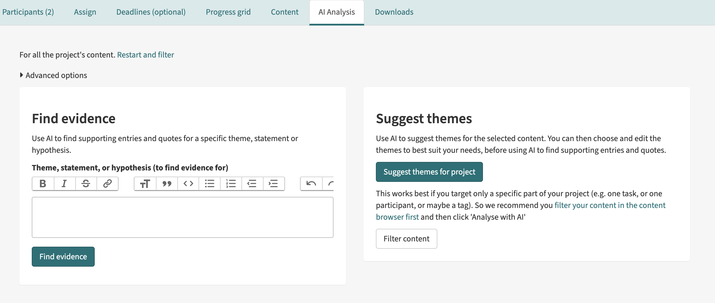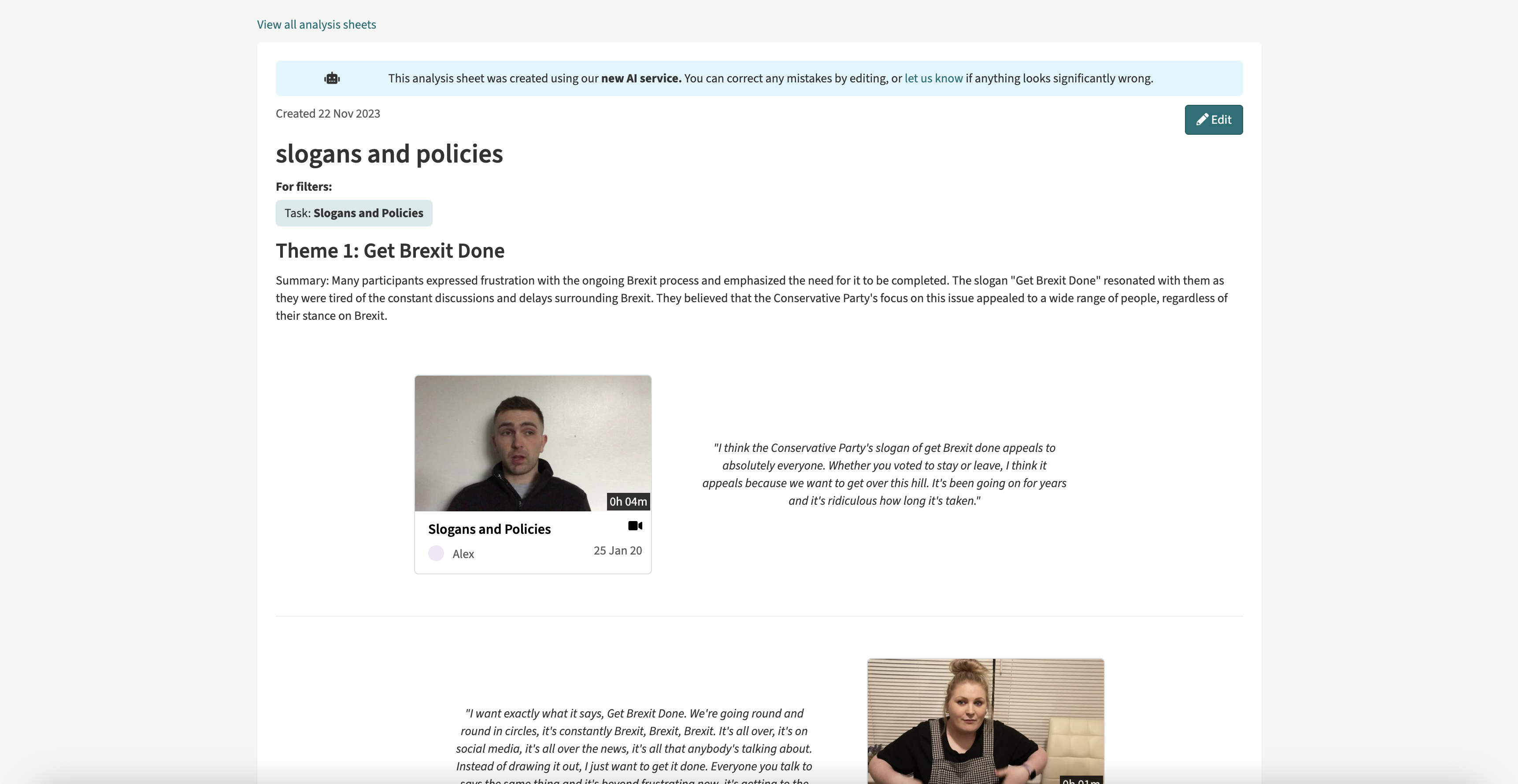 This AI-based tool enables automatic content analysis, returning some key themes as well as supporting clips and quotes, so researchers can see exactly what those themes are based on (minimising common AI-related issues as biases and hallucinations).