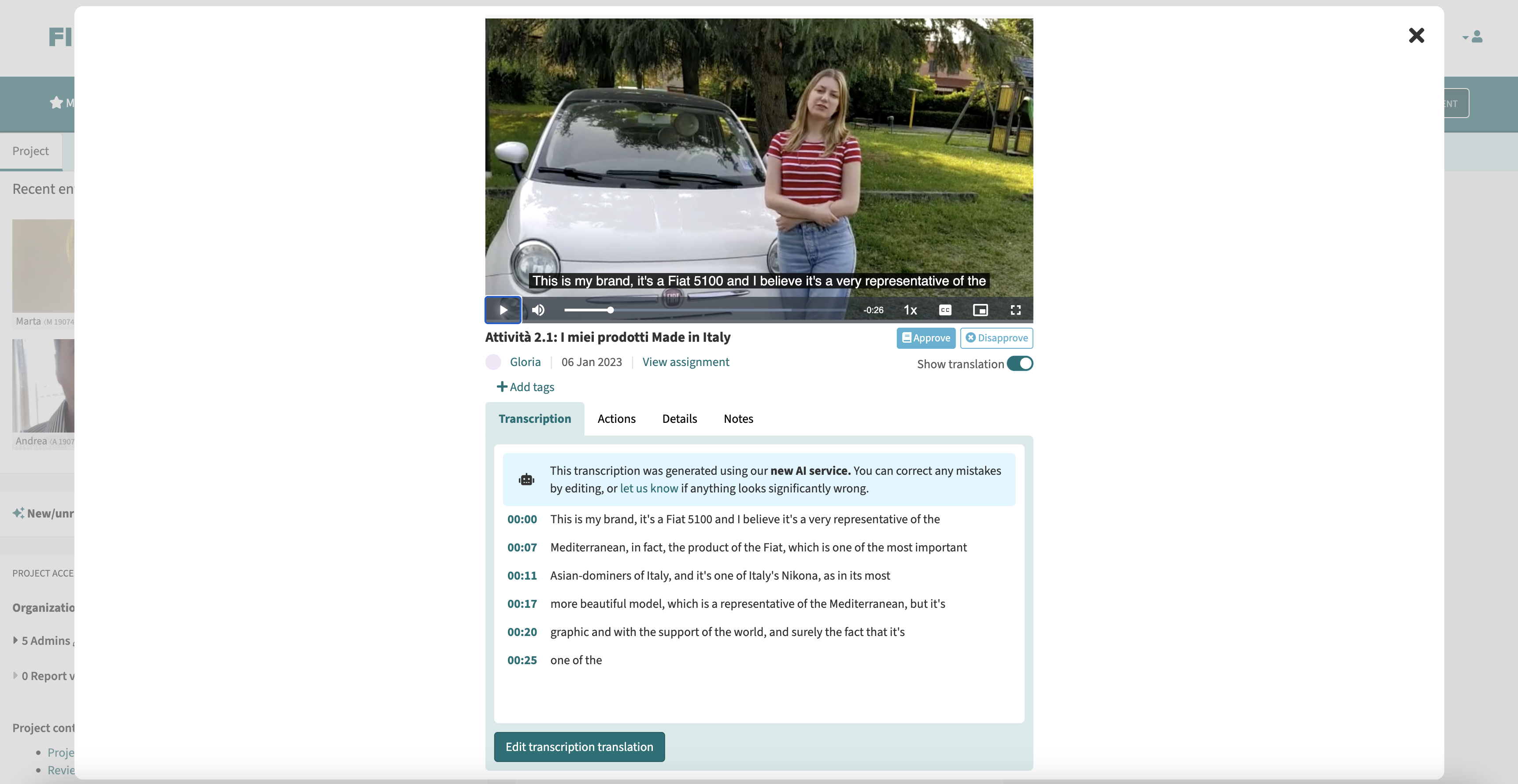 All the content uploaded on Field Notes is automatically transcribed via Speechmatics and then translated via DeepL, delivering unprecedented accuracy and the ability to display time codes and to view and download subtitles.