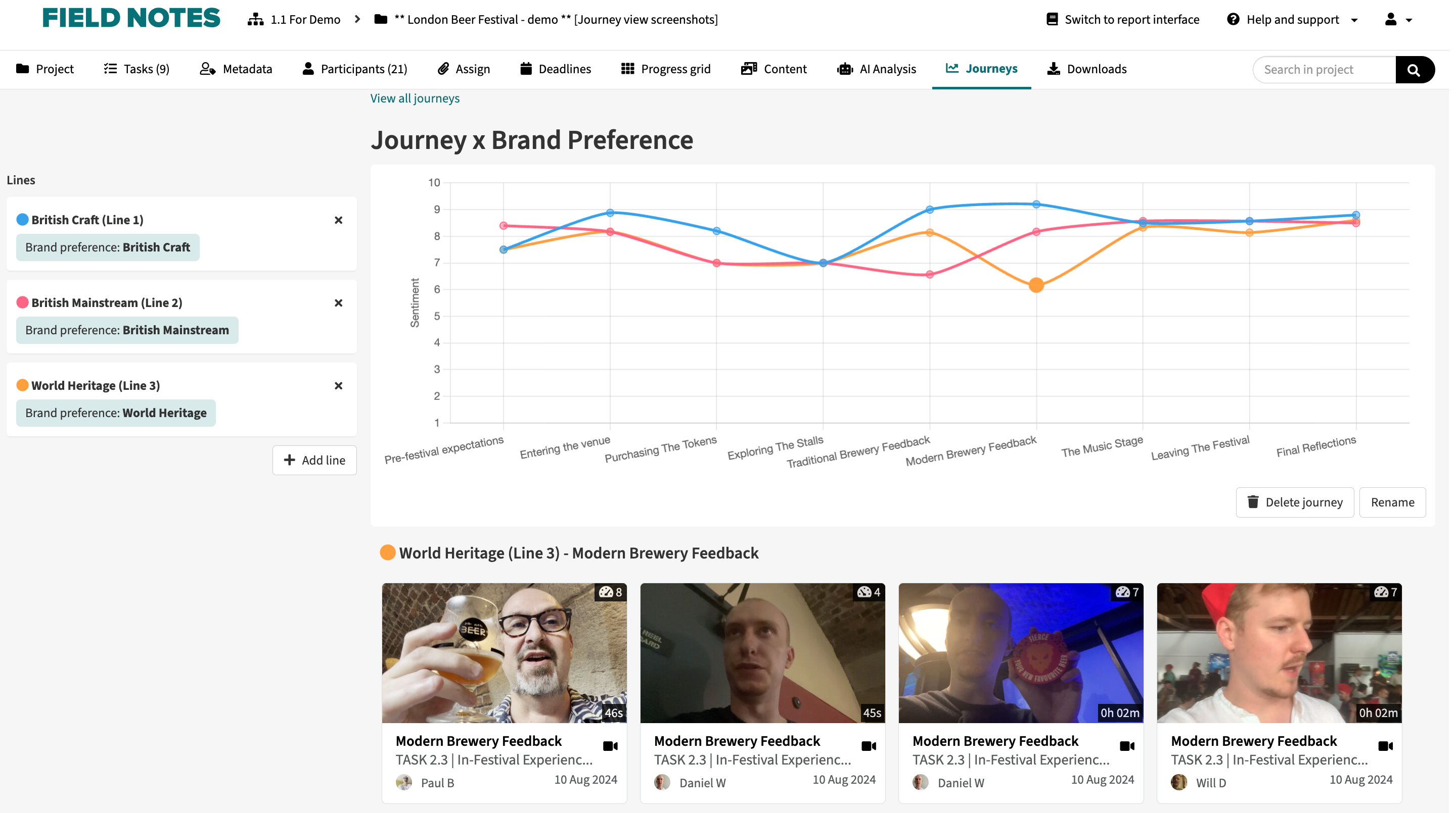 With journey mapping, researchers can automatically visualise participant journeys on a timeline, enriched with AI-generated sentiment analysis to reveal emotional highs and lows.